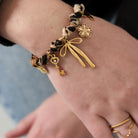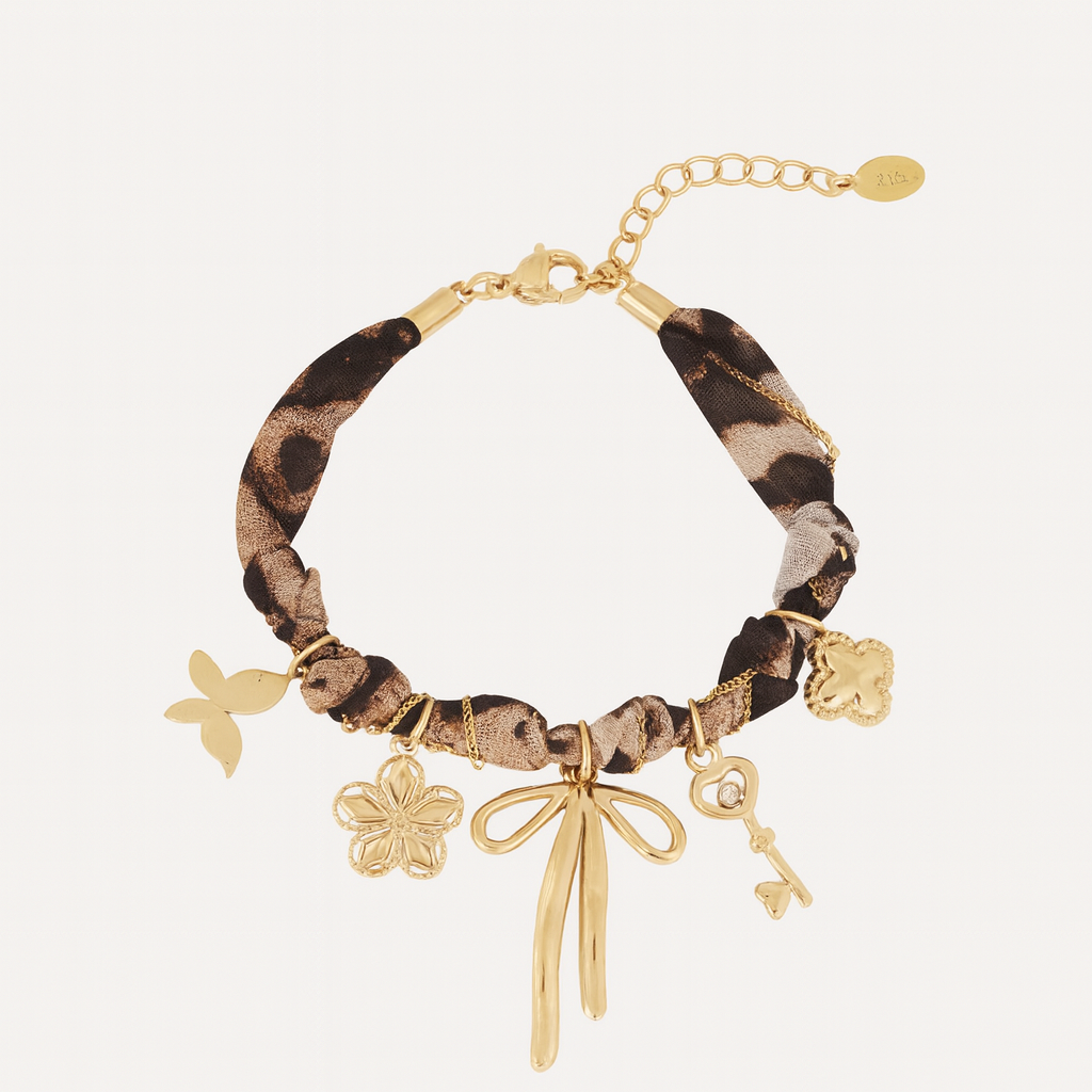 De Wild Winter Bracelet is een speelse mix van charme en karakter. De leopard-print stof vormt de basis voor een reeks goudkleurige bedels – van een vlinder en bloem tot een sleutel en strik. Elk detail straalt warmte en persoonlijkheid uit, perfect voor winterse looks met een wilde twist. Draag solo of combineer met andere armbanden voor een gelaagde stijl.