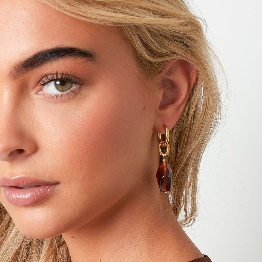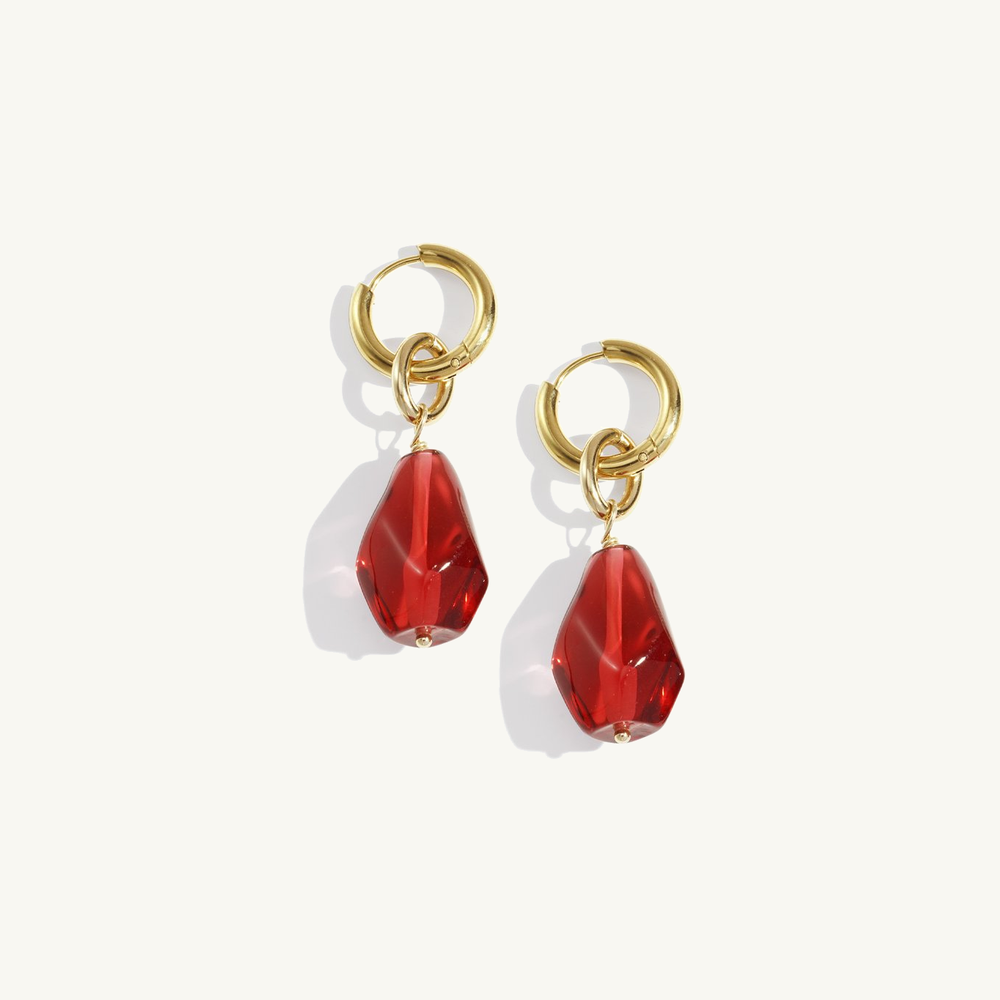 De Crimson Drop Earrings vangen het licht met hun diep robijnrode hangers, bevestigd aan glanzende gouden hoops. De combinatie van warmte en elegantie maakt ze perfect voor zowel een casual touch als een avond vol allure.