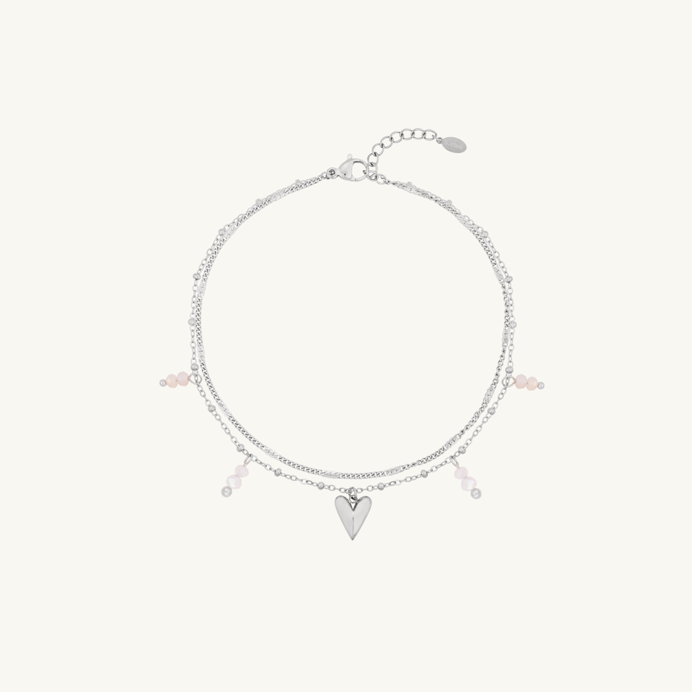 De Luna Love Anklet combineert gouden schakels met roze kraaltjes en een glanzende hartbedel. De dubbele laag geeft een luchtig, speels effect – perfect voor zomerse dagen met een romantische twist.
