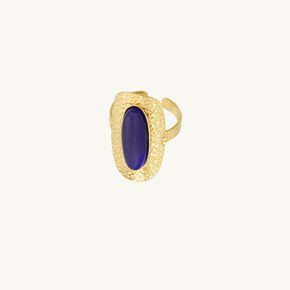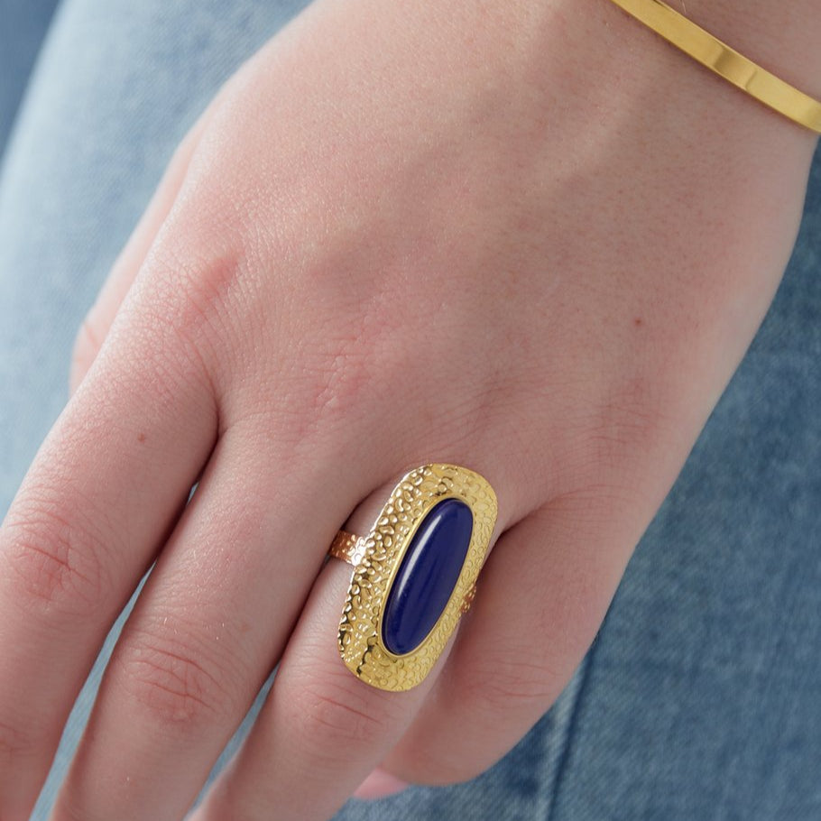 De Mira Ring is gedurfd en elegant met een diepe koningsteen en een gehamerde, organische omlijsting. Een vintage-geïnspireerd statement piece dat kracht en finesse combineert in één ontwerp.