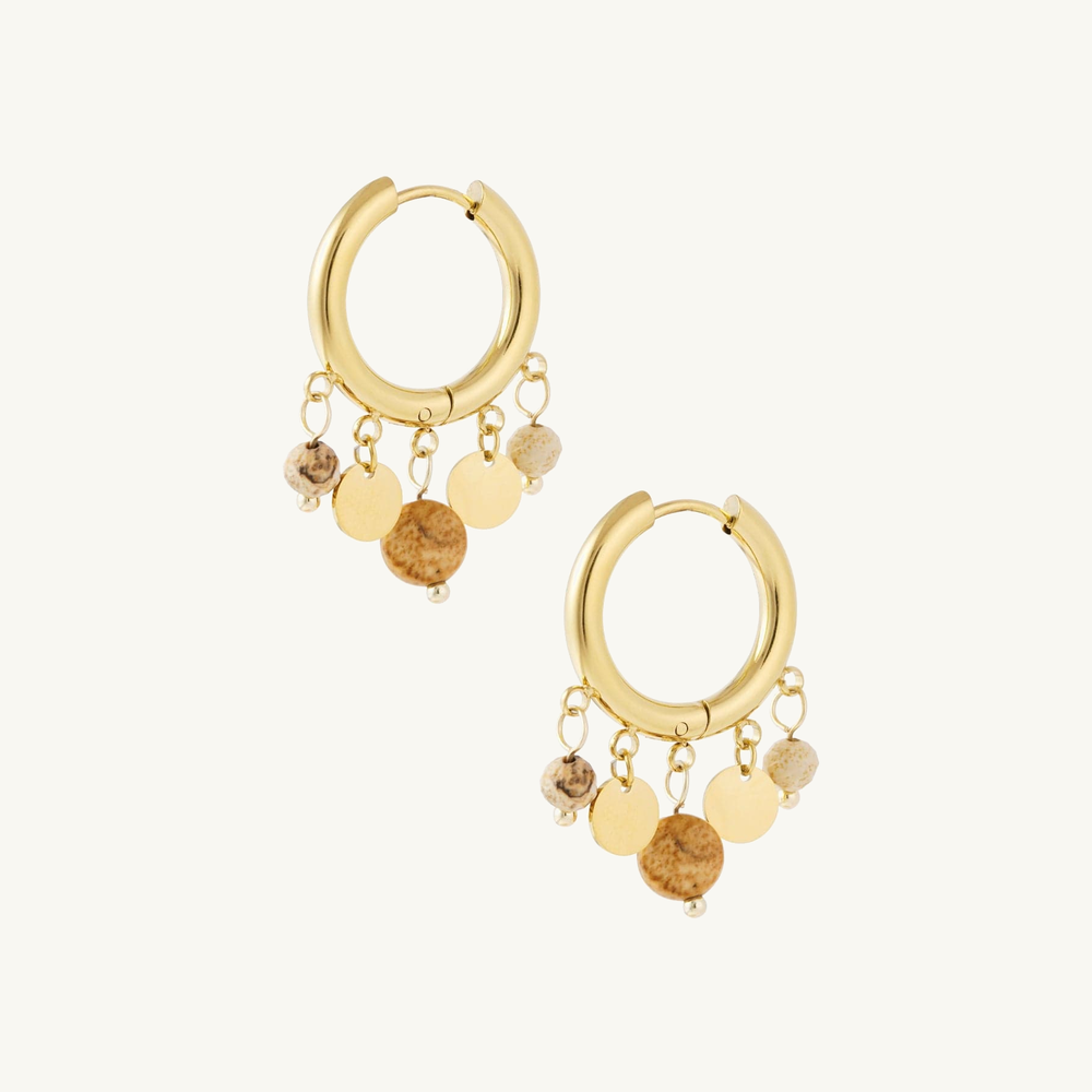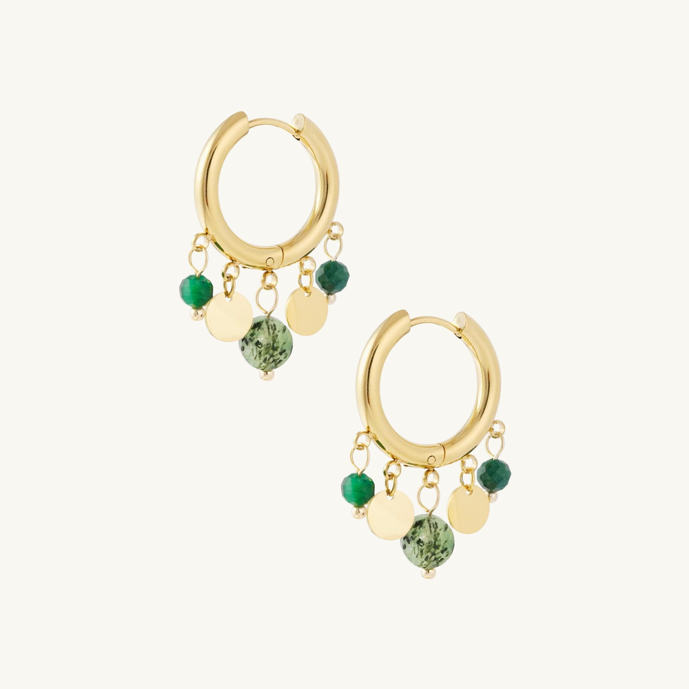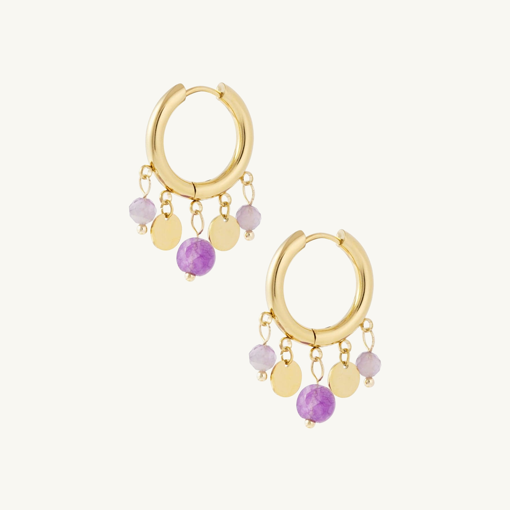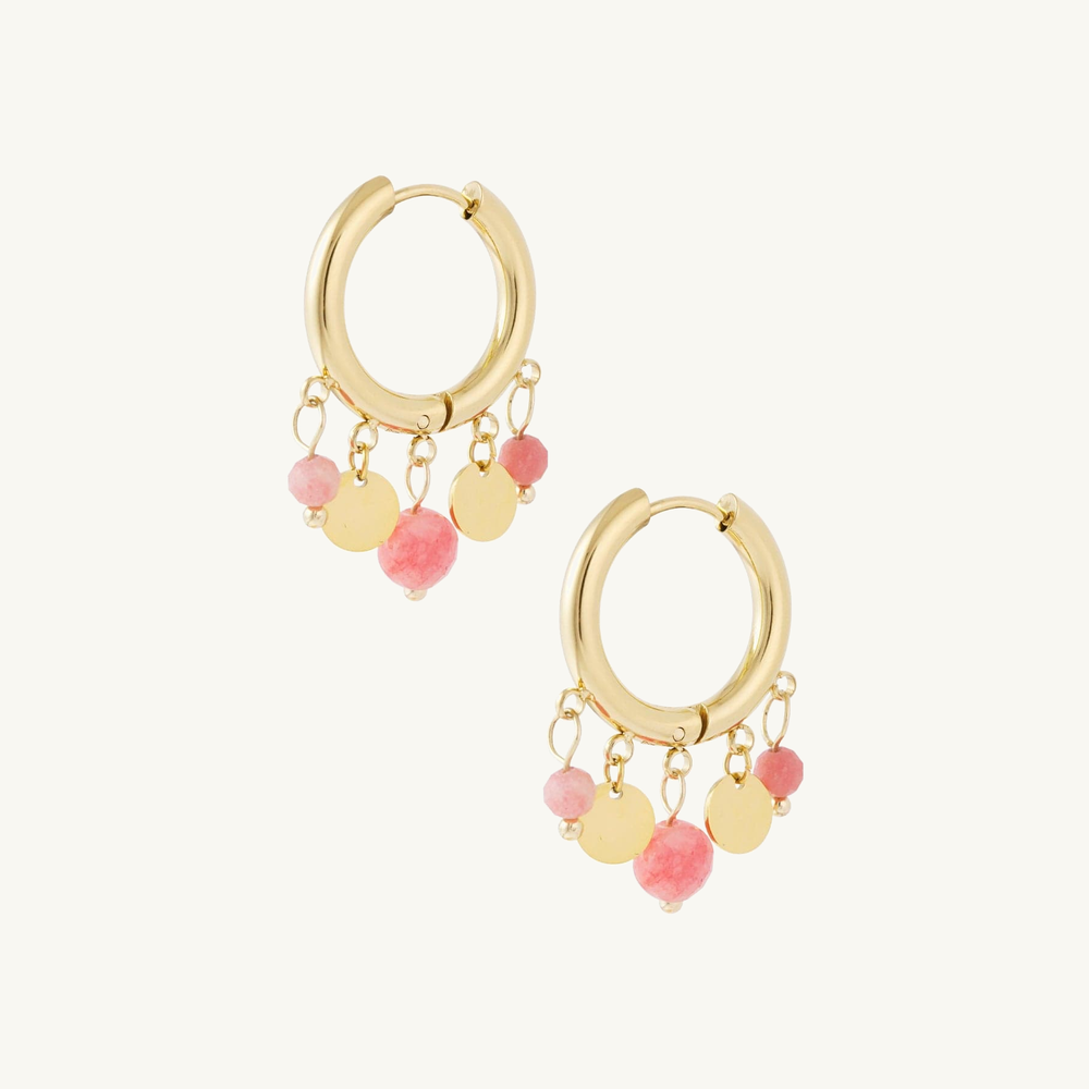 Deze verfijnde oorbellen combineren glanzende muntbedels met zachte, gekleurde steentjes voor een speelse en elegante uitstraling. Perfect om je dagelijkse outfit net dat beetje extra te geven, of om een vrouwelijke touch aan je avondlook toe te voegen. Een charmante must-have voor elke sieradencollectie.