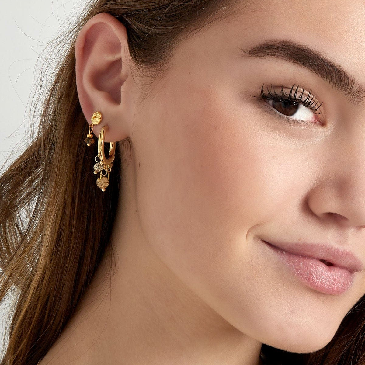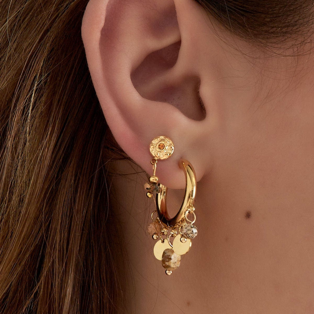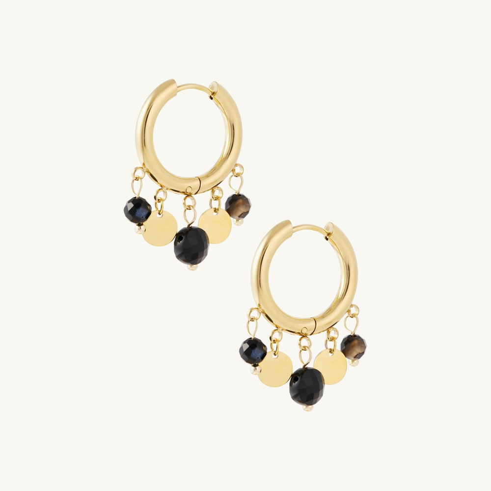 Deze verfijnde oorbellen combineren glanzende muntbedels met zachte, gekleurde steentjes voor een speelse en elegante uitstraling. Perfect om je dagelijkse outfit net dat beetje extra te geven, of om een vrouwelijke touch aan je avondlook toe te voegen. Een charmante must-have voor elke sieradencollectie.