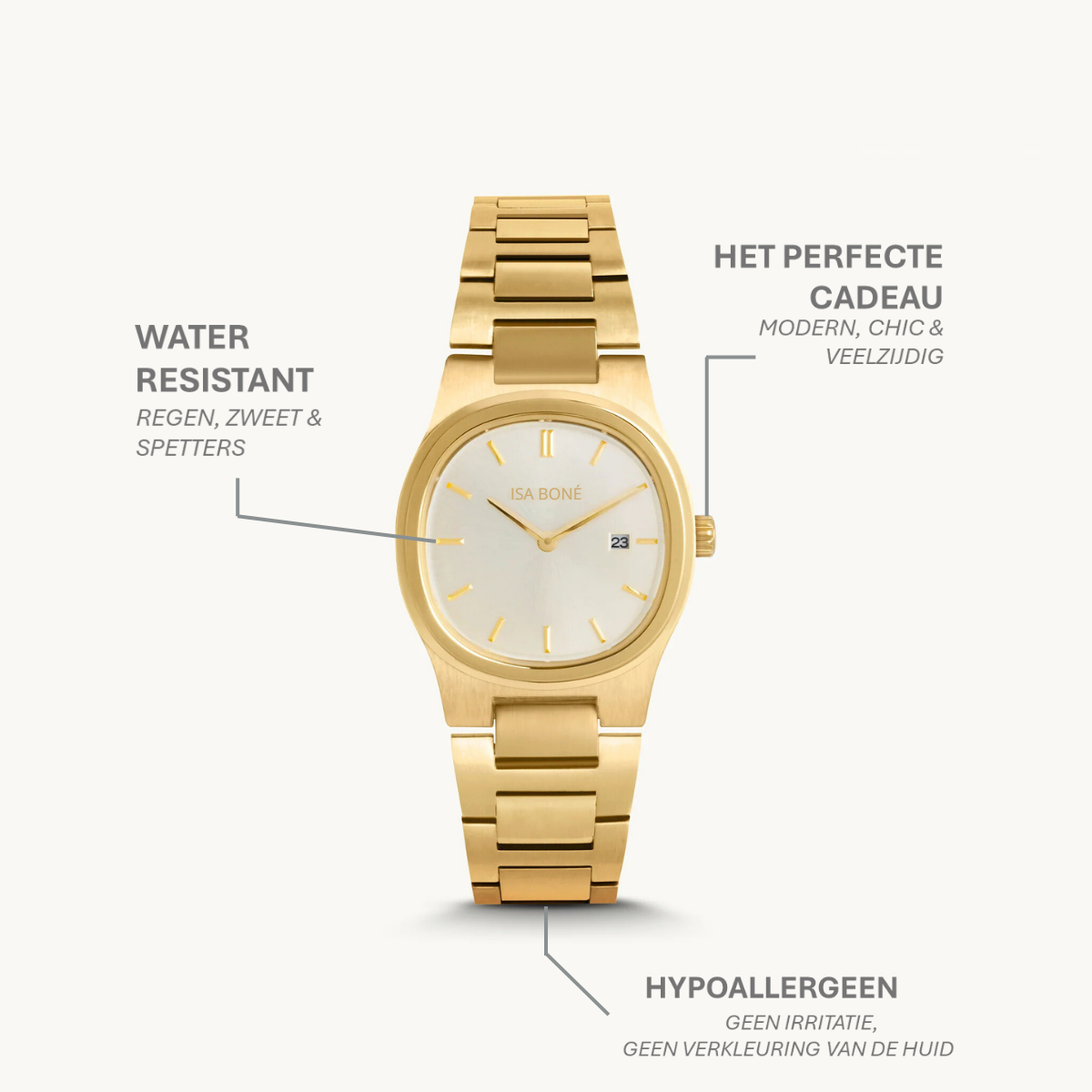 De prijswinnende horloge die keer op keer uitverkocht raakt, deze horloge combineert een helderwitte wijzerplaat met tijdloze gouden band. Een licht, modern design dat onmiddellijk een hoogwaardige en stijlvolle indruk achterlaat.
