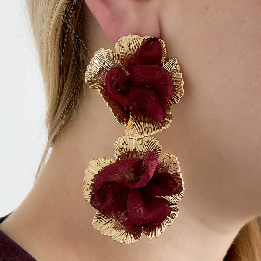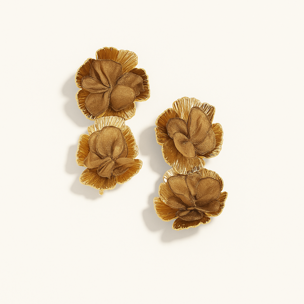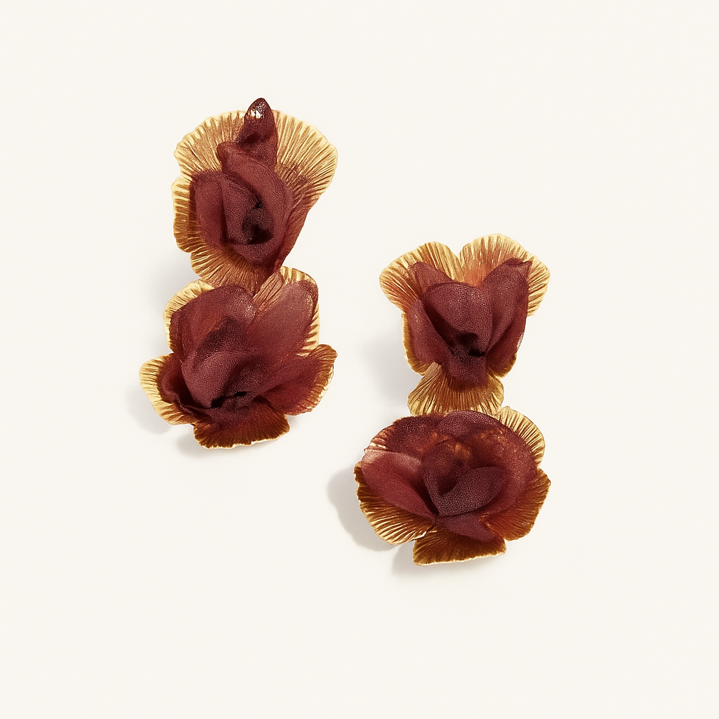 De Autumn Blossom Earrings brengen de magie van de herfst tot leven. Met diepe, warme tinten en gouden bloembladeren die schitteren als vallend herfstblad, stralen deze oorbellen een charmante elegantie uit. Perfect om elke herfstoutfit een romantische en speelse twist te geven – alsof je een stukje van het seizoen met je meedraagt.