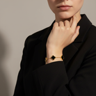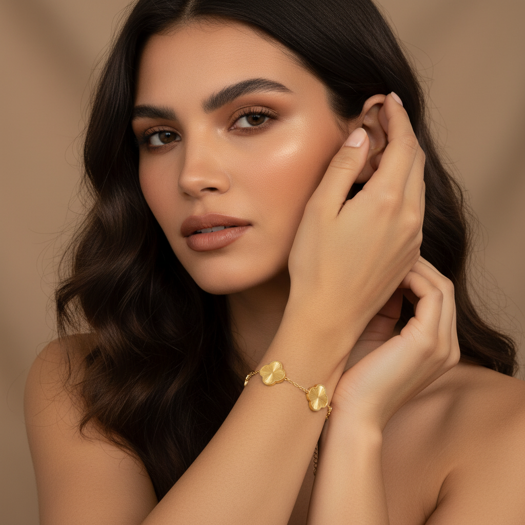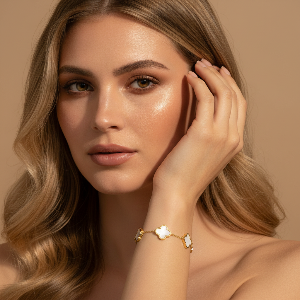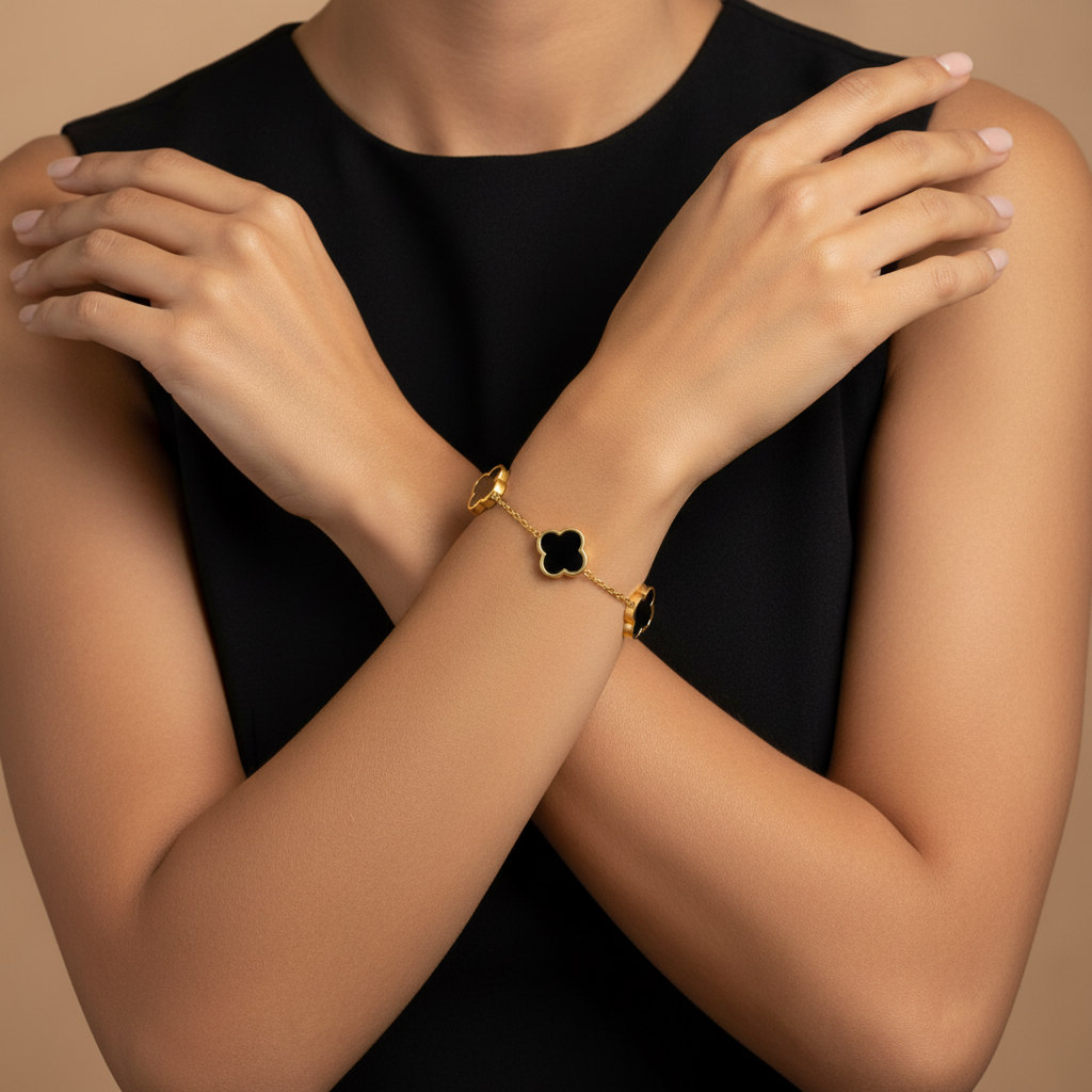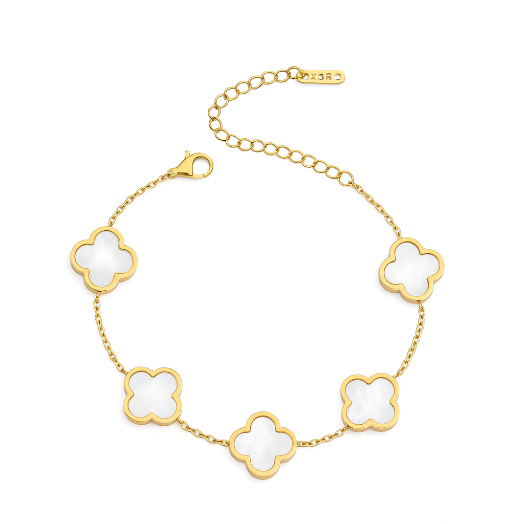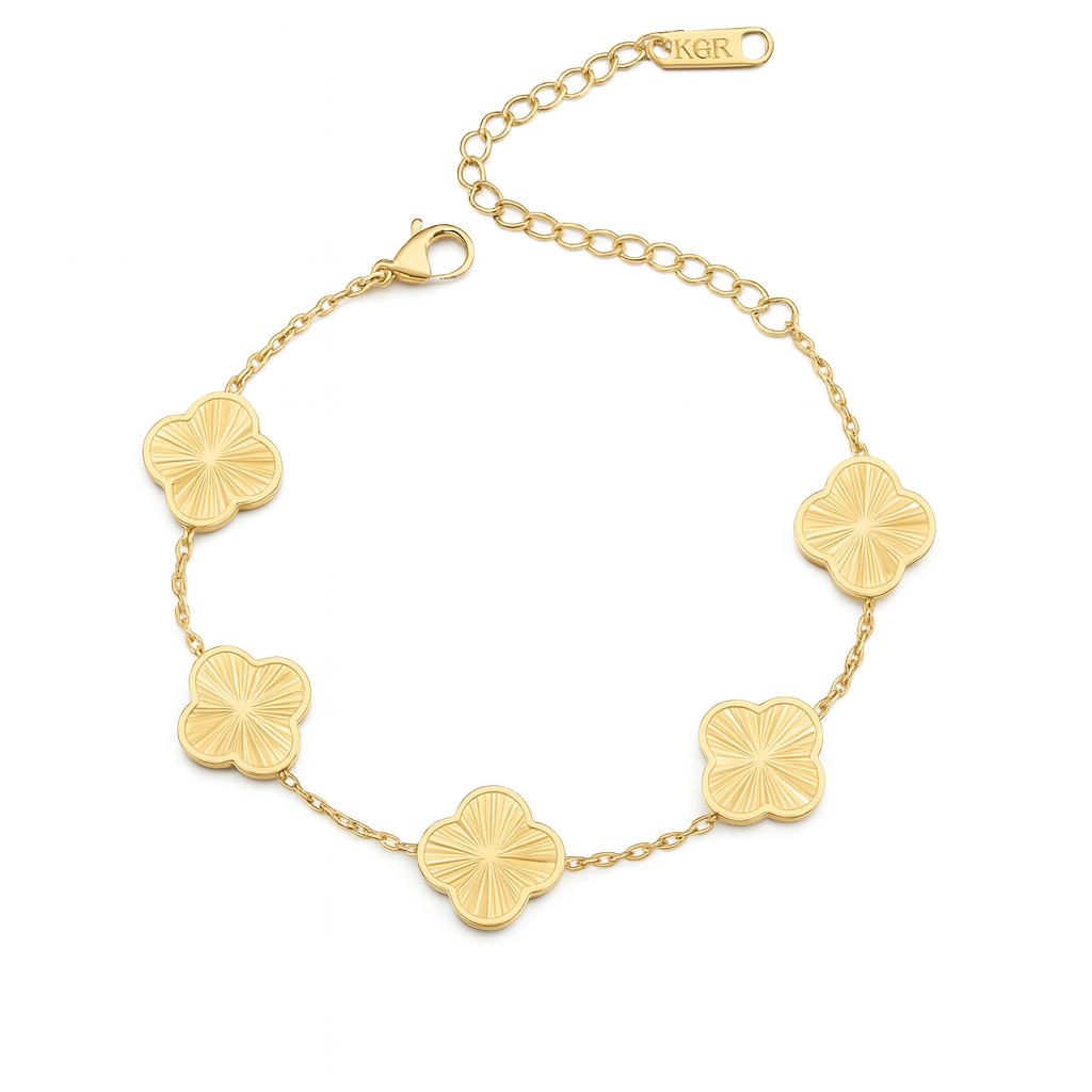 Elegante armband met vijf klaverbedels in een volle goudkleurige omlijsting. Tijdloos design dat direct luxe en karakter toevoegt.