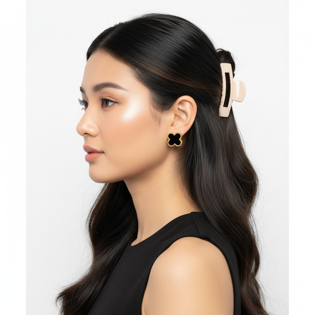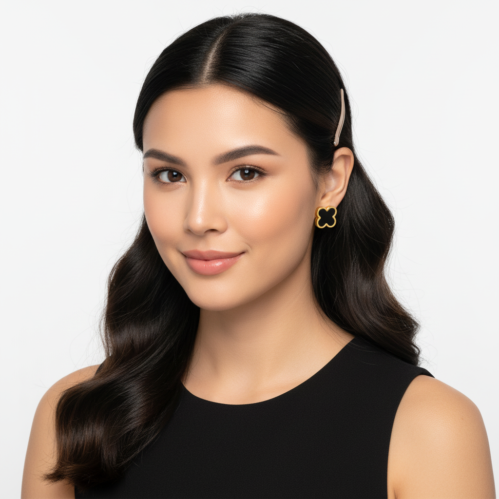 Strakke, tijdloze studs met een diepgekeurde clover-vorm die elegant contrasteert met de warme goudtint. Perfect afgewerkt voor een luxe uitstraling en ideaal om elke look moeiteloos te versterken.