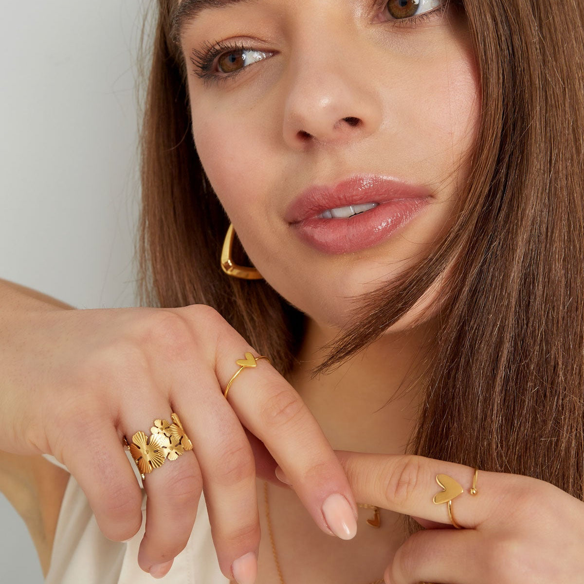 Onze sieraden zijn vervaardigd uit 18k premium gold plated en silver plated brass. Dankzij de hoogwaardige plating behoudt elk sieraad zijn glans en gaat het jarenlang mee.