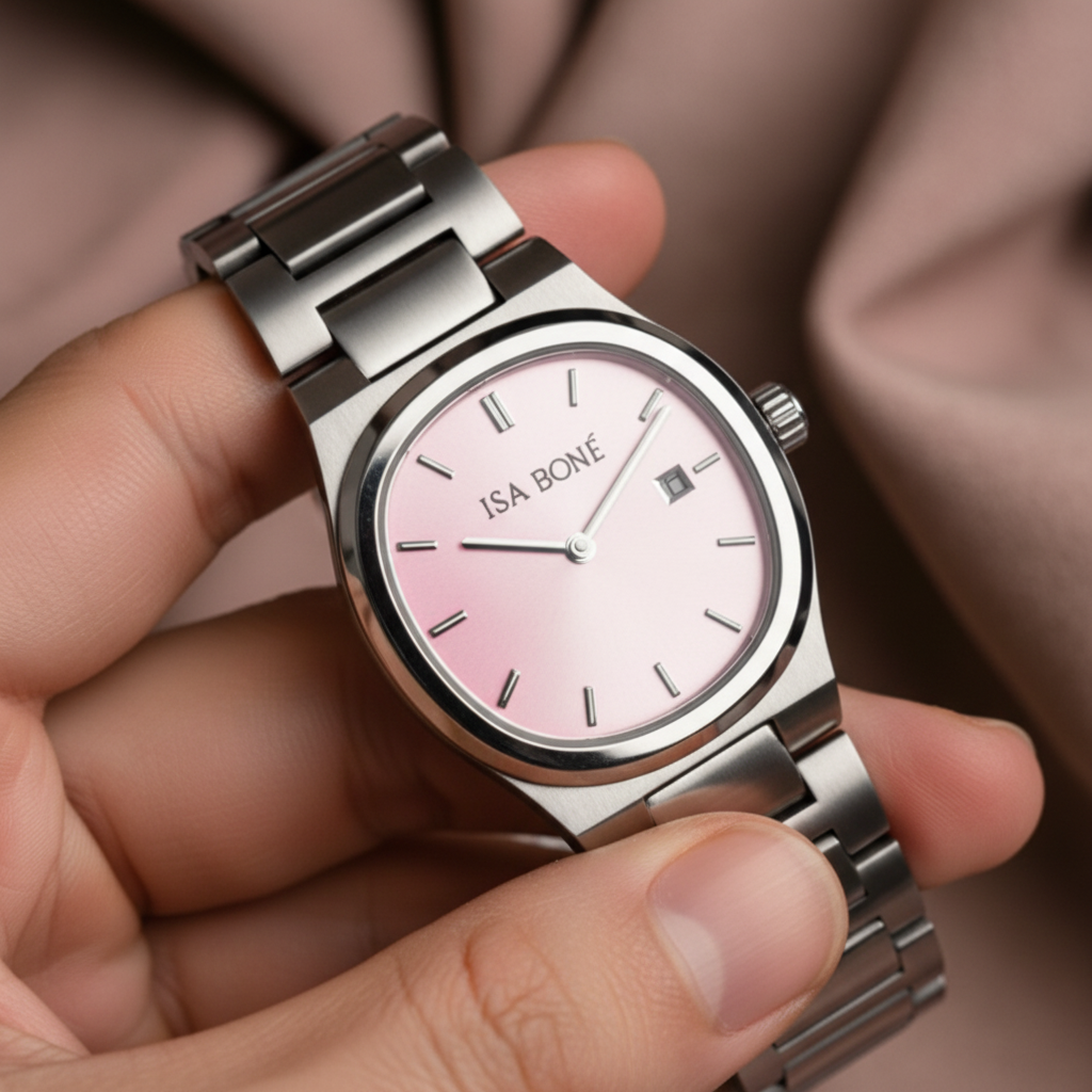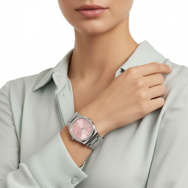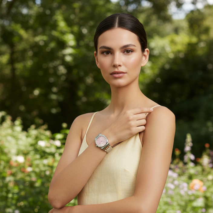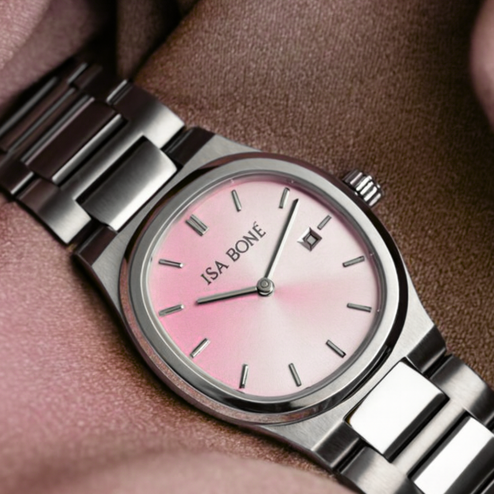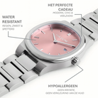De prijswinnende horloge die keer op keer uitverkocht raakt, deze horloge straalt zachtheid uit met haar elegante rosékleurige accenten en subtiele roze wijzerplaat. Een verfijnd statementstuk dat warmte en luxe moeiteloos samenbrengt.